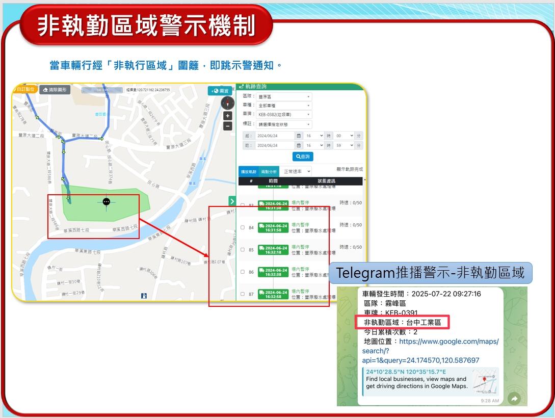 台中市政府環保局秉持廉能與專業,嚴格要求清潔人員遵守法令與風紀,不容任何不法行為。為加強落實管理,特別導入「清潔車即時衛星定位管理系統」,透過GPS科技即時監控行車軌跡。三年來主動查獲相關人員偏離路線或非法協助不法業者清運廢棄物案件,依法給予嚴懲並主動移送司法偵辦,展現市府科技監管、嚴查不法的決心。