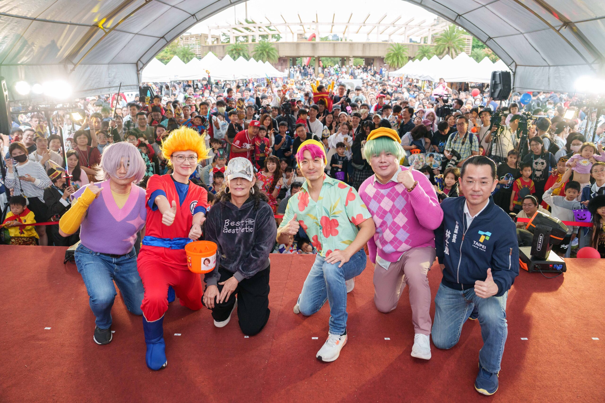 蔣萬安市長今(1)日驚喜現身「天母搞什麼鬼」萬聖節嘉年華,化身為人氣 Kpop 獵魔女團「Saja Boys」的Abby與現場民眾掀起活動高潮!