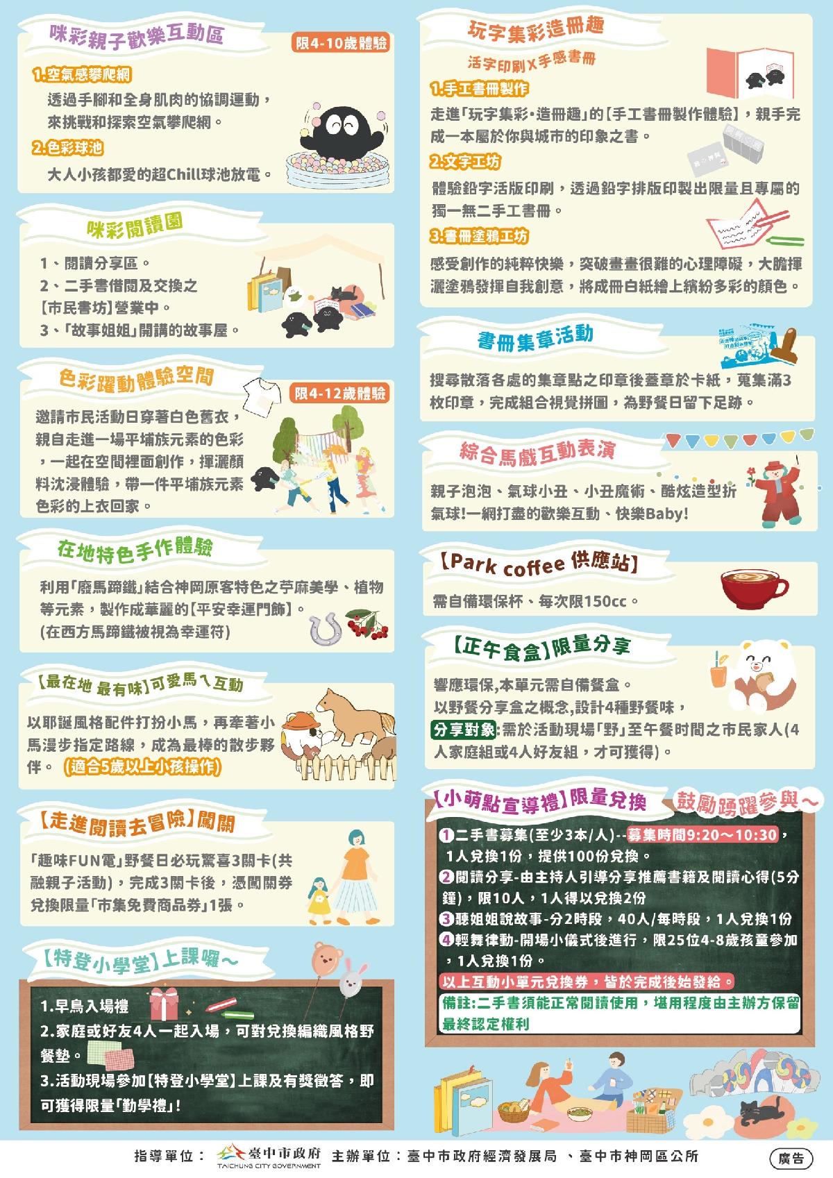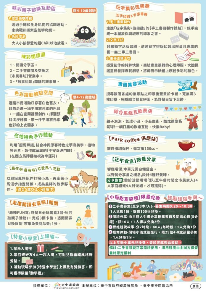 此外也推出「在地特色手作體驗」,以馬蹄鐵與苧麻打造「平安幸運門飾」;可愛的迷你馬與民眾互動拍照,成為最受歡迎的打卡亮點;「玩字集彩造冊趣」讓小朋友體驗活字印刷裝幀小書,培養創作樂趣;「特登小學堂」透過趣味互動問答,例如介紹位在神岡區的「豐洲科技工業園區」產業特色及進入工廠的小知識等,將產業發展教育向下扎根。草地上更有泡泡秀、小丑魔術表演與音樂律動,為秋日午後添上熱鬧氛圍。