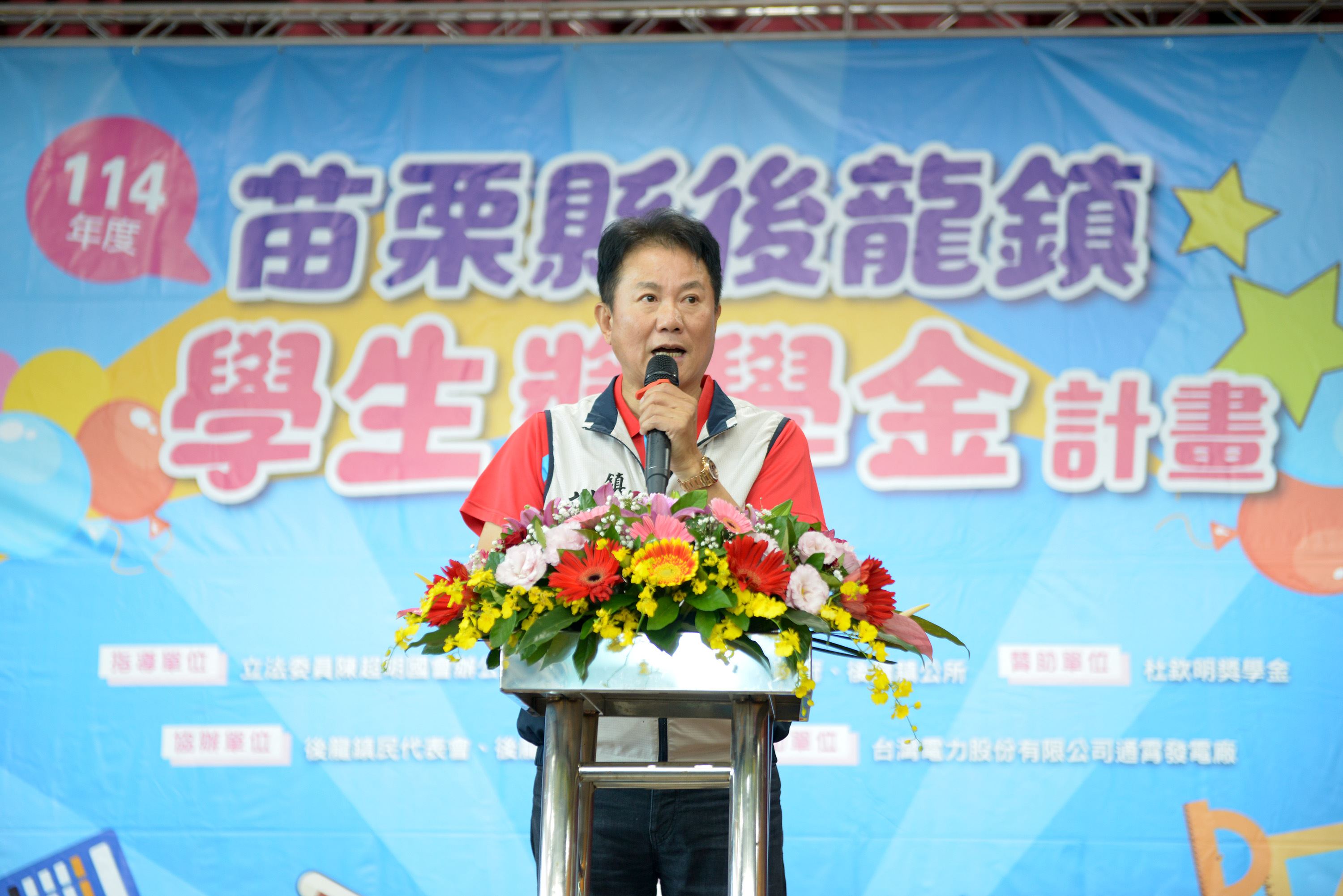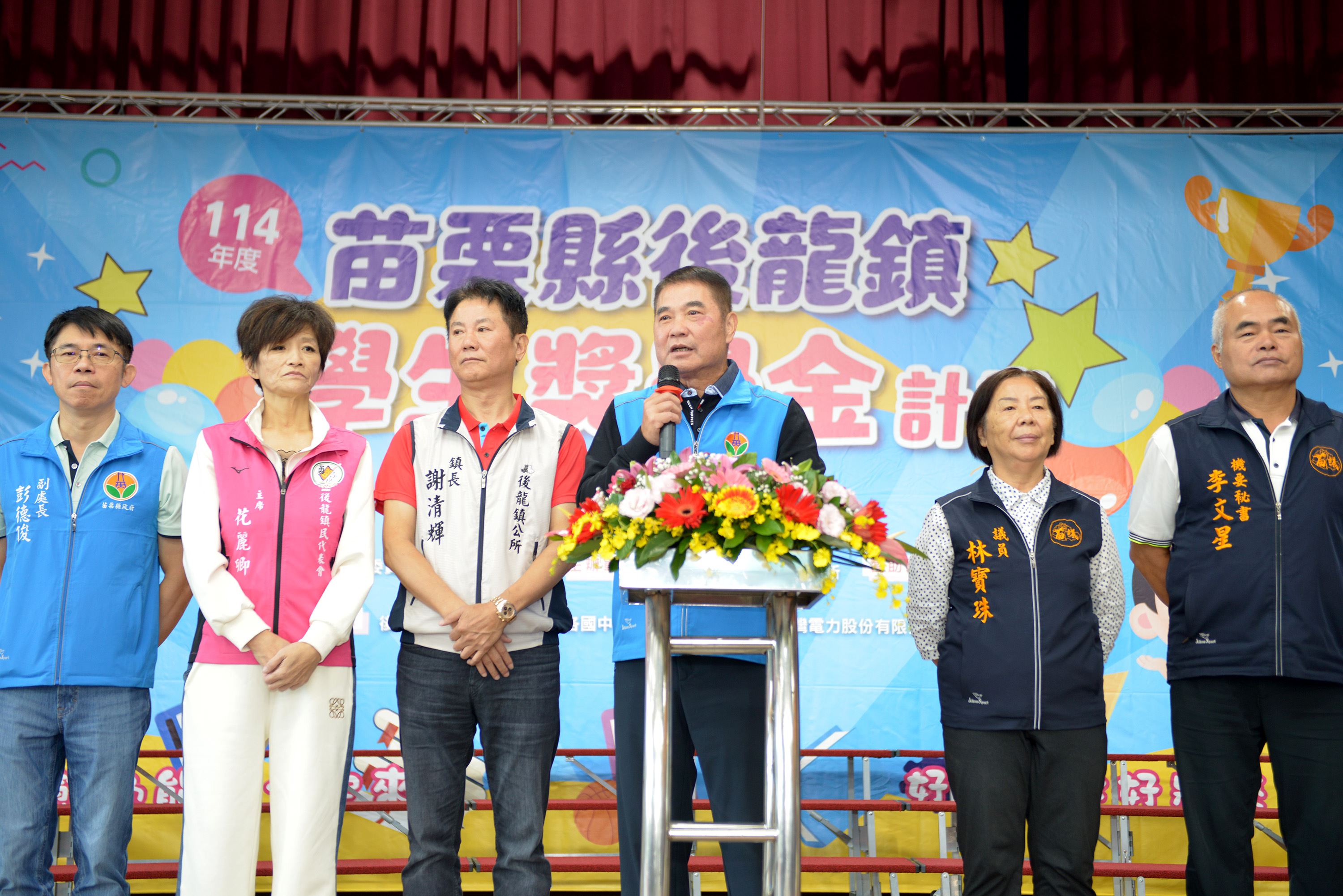 鎮長謝清輝表示,恭喜所有獲獎學生努力學習獲得肯定,也感謝所有家長和老師辛勤的教導和培養,公所每年頒發獎學金,就是為了鼓勵學生勤奮向學,未來能成為社會棟樑、回饋鄉里,他也特別感謝杜欽明獎學金贊助公所100萬元。謝清輝指出,公所重視孩子的教育,從幼兒園入學起就發送每位學生書包、餐具及鉛筆盒等文具,國小畢業有畢業禮金,明年開始要實施國中畢業禮金發放。另外為了留住人口,設籍在後龍滿一年的青年朋友,可領1萬元結婚禮金,生育津貼第一、二胎為1萬2000元,第三胎以上3萬6000元。