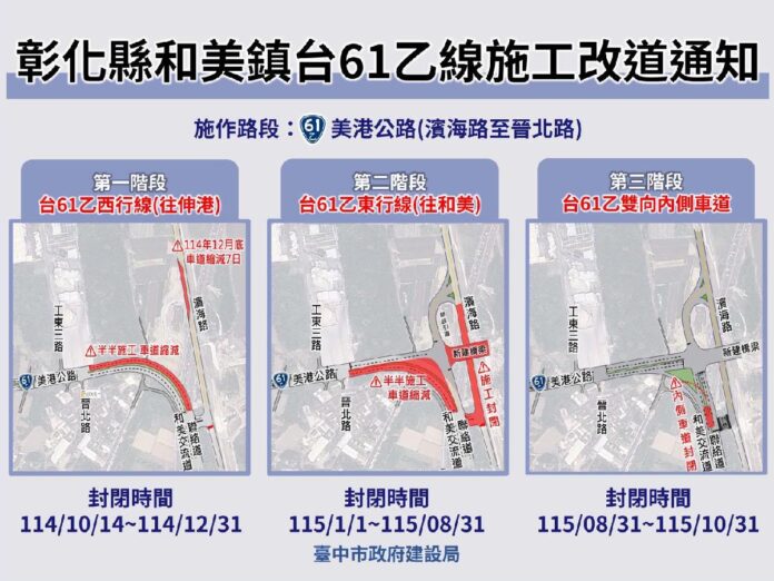 第一階段自即日至12月31日,封閉台61乙西行線(往伸港方向),並改道至東行線,原雙車道調整為「雙向各一車道通行」;另於濱海路近國道三號橋下,預計12月中下旬封閉部分南下路段,改由北上路段採取雙向管制,彈性輪流通行。