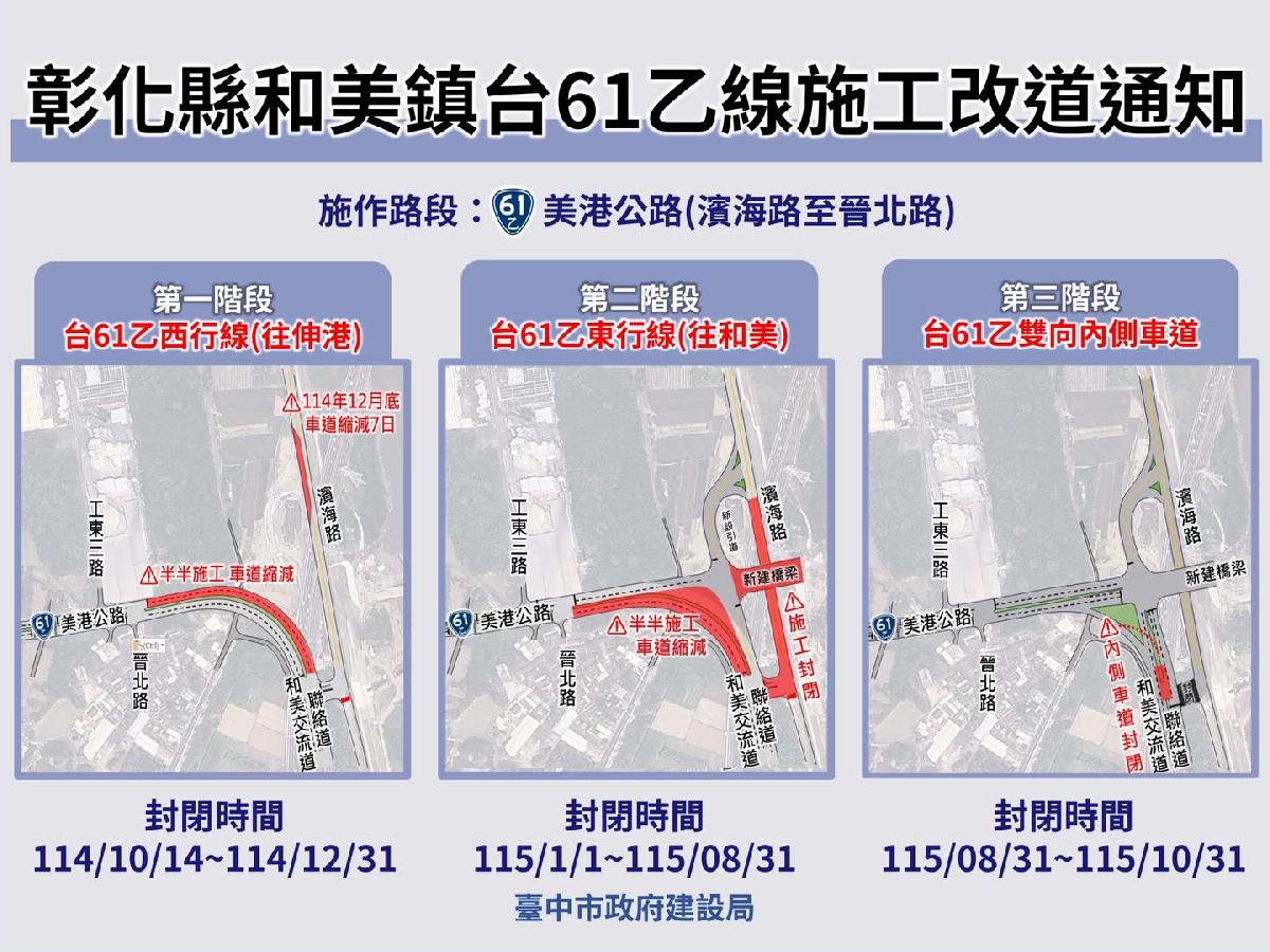 第三階段自115年8月31日至10月31日封閉台61乙雙向內側車道,改行駛雙向外側車道,以完成橋梁與引道銜接工程。