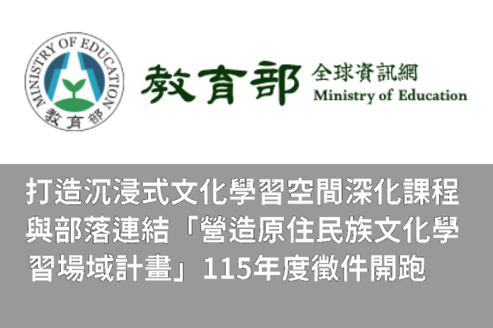 教育部國教署為推動原住民族文化教育,辦理115年度「營造原住民族文化學習場域計畫」,鼓勵學校以課程發展為核心,結合部落耆老智慧及在地文化資源,共同營造具原住民族特色與永續精神的文化學習場域。自115年起,申請對象將擴大至全國國中小,學校應由課程內容發想,結合環境設計,打造融合教學與文化的校園學習場域,以提升老師的教學品質及學生的學習成效,申請截止日期為114年12月1日止,申請資訊請至「教育部國民及學前教育署原住民族教育資訊網」(https://ieiw.k12ea.gov.tw/#1&gsc.tab=0)查詢,歡迎學校踴躍提案。
