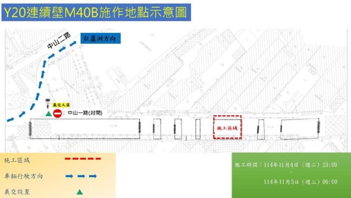 為配合捷運北環段CF680A區段標工程施作站體南側連續壁工程,施工單位將於114年11月4日23時起迄11月5日上午6時止,將封閉蘆洲區中山一路415號(消防局前)至中山一路339巷口止之單行道,俾進行車站站體連續壁M40B單元搭接鋼筋籠作業,施工因吊車占據車道,為維護大眾安全,屆時將封閉中山一路單行車道路段,所有車輛均請改行駛中山二路進入蘆洲市區,本工程施作當日若遇豪大雨則順延至次日施工,相關本次影響行車動線範圍,如附圖所示。 施工期間請用路人配合改道通行,如行經施工區域請減速慢行,並請遵循相關導引標誌、標線及現場指揮人員導引減速慢行,民眾如有任何問題以及建議事項,或想瞭解最新施工動態,可隨時利用下列聯絡電話反映,將有專人竭誠為您服務與解說,施工造成暫時不便,敬請見諒。