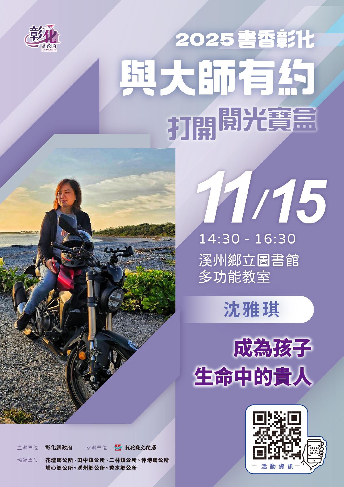 彰化縣文化局2025「書香彰化-與大師有約」系列講座,透過邀請各領域重量級作家分享專業知識與人生見解,引領民眾廣泛閱讀,將書香帶入生活,讓民眾猶如打開閱光寶盒,從中獲得知識的寶藏!年度第11場專題講座訂於11月15日(星期六)下午2:30在溪州鄉立圖書館多功能教室舉行,著名親子教養作家沈雅琪將以「成為孩子生命中的貴人」為題,與民眾分享如何在教育現場中播下善意的種子,讓每位孩子都能在愛與接納中成長,歡迎大家踴躍前往聆聽。