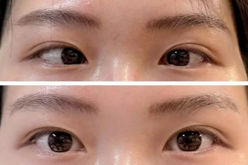 斜視的個案(上圖),透過訓練可使眼位逐步獲得改善,並能更有意識地維持正確的注視位置(下圖)。