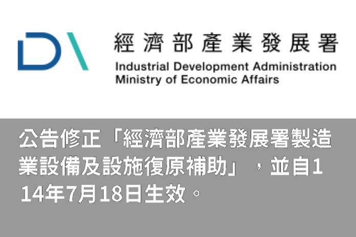 產經消費公告修正「經濟部產業發展署製造業設備及設施復原補助」,並自114年7月18日生效。 產經消費 公告修正「經濟部產業發展署製造業設備及設施復原補助」,並自114年7月18日生效。 編輯 江 秉鈞 2025-11-04 依據:經濟部丹娜絲颱風與七二八豪雨災後商家援助與設備汰換及產業設施復原辦法第5條第3項。 Tags經濟部產業發展署 延伸閱讀 商情 璟洸清潔提供居裝潢細清家辦公室冷氣清潔服務台北地區 商情 璟洸清潔–台北中山居家清潔、新北裝潢細清、洗地打蠟 商情 台南樹瀚科技打造客製化木箱棧板廢木回收循環經濟平台 商情 樹瀚科技環保–台南機械木箱、木棧板訂製、廢木材清運