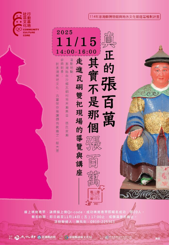 澎湖縣政府文化局今(114)年於白沙鄉瓦硐村,舉辦「真正的張百萬其實不是那個張百萬」教育推廣活動,針對澎湖傳統祭祀文化、古墓保存等議題,邀請民眾一同探索祖先崇祀、家族記憶與地方信仰的深層意義,揭開祖先祀典的秘密。