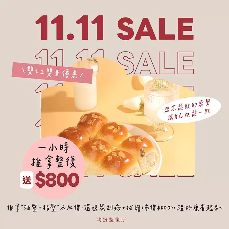 限時優惠專案|請提前預約。可針對不同族群提供客製化調理建議。這個雙11優惠期間,不只是購物節,更是你身體的「修復節」。無論你是上班族想享受頂級專業下班舒壓,還是年輕媽媽想體驗深層骨盆調理,都能在蘆洲均挺整復所找到最合適的療癒方案。立即預約,享受你的雙11專屬放鬆體驗!
