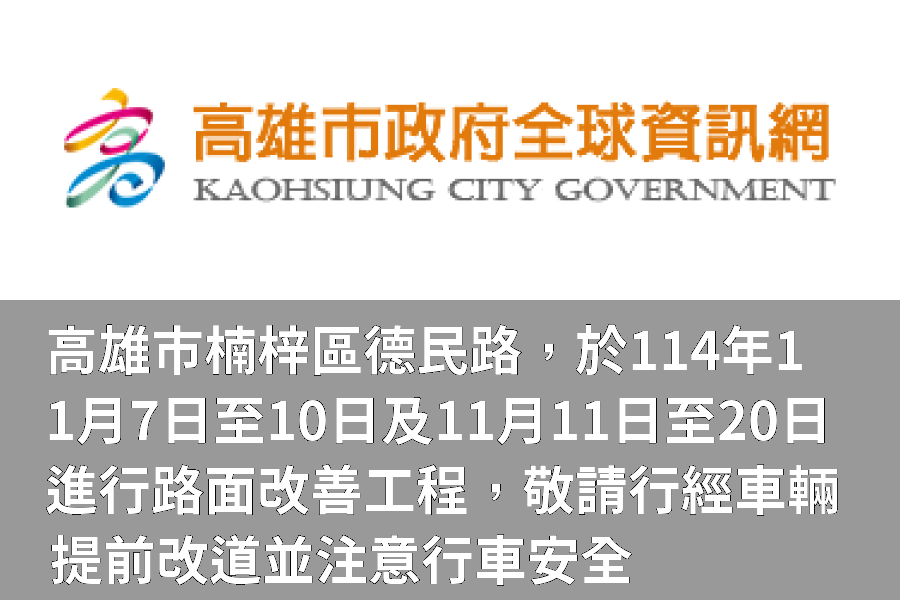 為改善高雄市道路通行品質,工務局道路養護工程處將於11月7日至10日進行德民路(外環西路-高楠公路)西向機車道路面改善;於11月11日至20日進行德民路(外環西路-高楠公路)快車道路面改善。施工時段為晚間8時至隔日晨間6時。另為顧及工程品質,刨鋪後均依施工規範封閉養護6小時以上或溫度降低至50°C以下始開放通車,確保道路使用壽命及品質,如遇天候不佳,將順延一天進場施工。