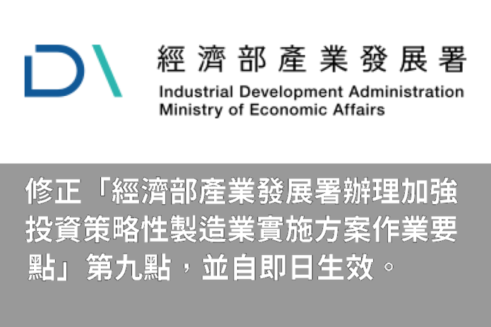 產經消費修正「經濟部產業發展署辦理加強投資策略性製造業實施方案作業要點」第九點,並自即日生效。