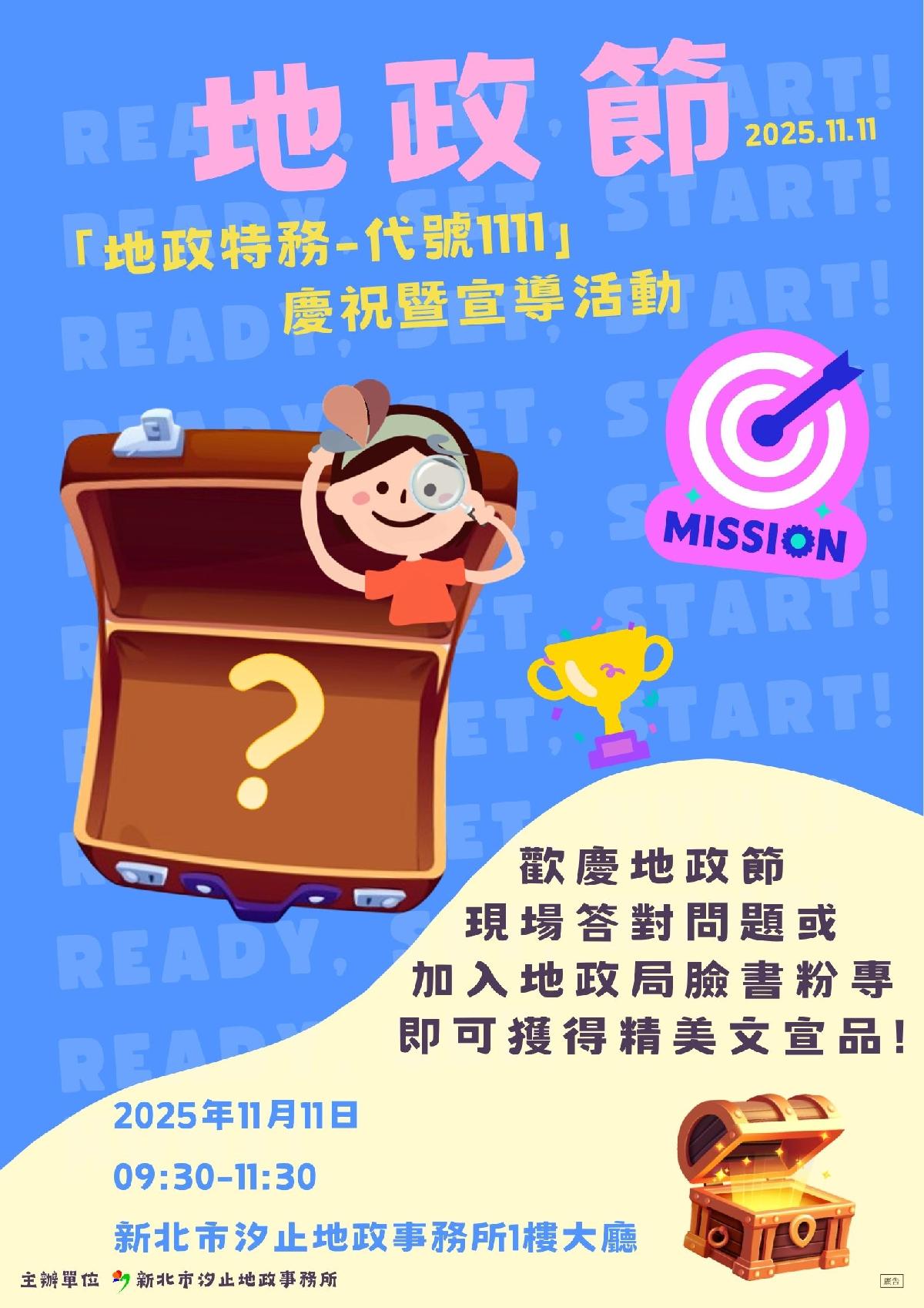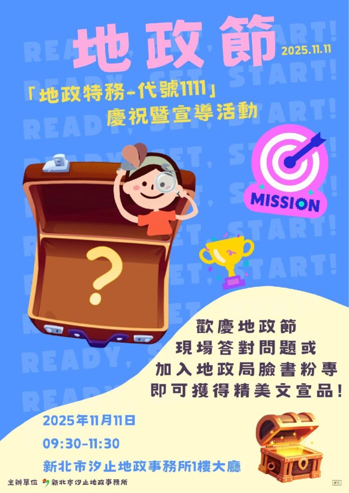 新北市汐止地政事務所為歡慶一年一度地政節,訂於114年11月11日上午9時30分至11時30分於1樓大廳,舉辦以「地政特務 代號1111」為主題,推出系列任務活動,結合宣導、體驗與互動闖關,邀請民眾一起化身地政特務,探索地政業務的多元面貌,體驗便民服務的進步與轉變。
