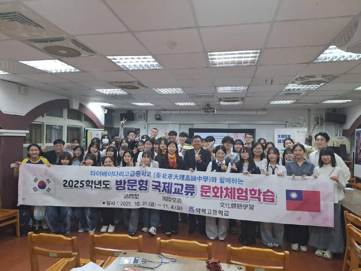 【臺北大理高中報導】11月15日是大理高中一年一度的校慶活動,隨著校慶月的到來,海外友校的祝賀及來訪亦絡繹不絕。除了老朋友—日本青森縣三本木高校—與本校學子進行專題線上交流,並祝賀本校58校慶之外,來自大韓民國的新朋友—慶尚北到漆谷郡若木(Yakmok)高校—由崔惠廷 (최혜정,英文CHOI HYEOJUNG) 校長帶領學務主任李健熏(이건훈、 英文LEE GEONHUN)、國際交流部長方大成(방대성,英文BANG DAESOENG)及學生18人,至本校進行教育交流,並在兩校師生代表的共同見證下,由雙方校長簽署深化教育合作的備忘錄。大理高中積極開展國際交流,不僅增添校慶的多元繽紛,更為校務經營之國際化願景打下厚實的底蘊。
