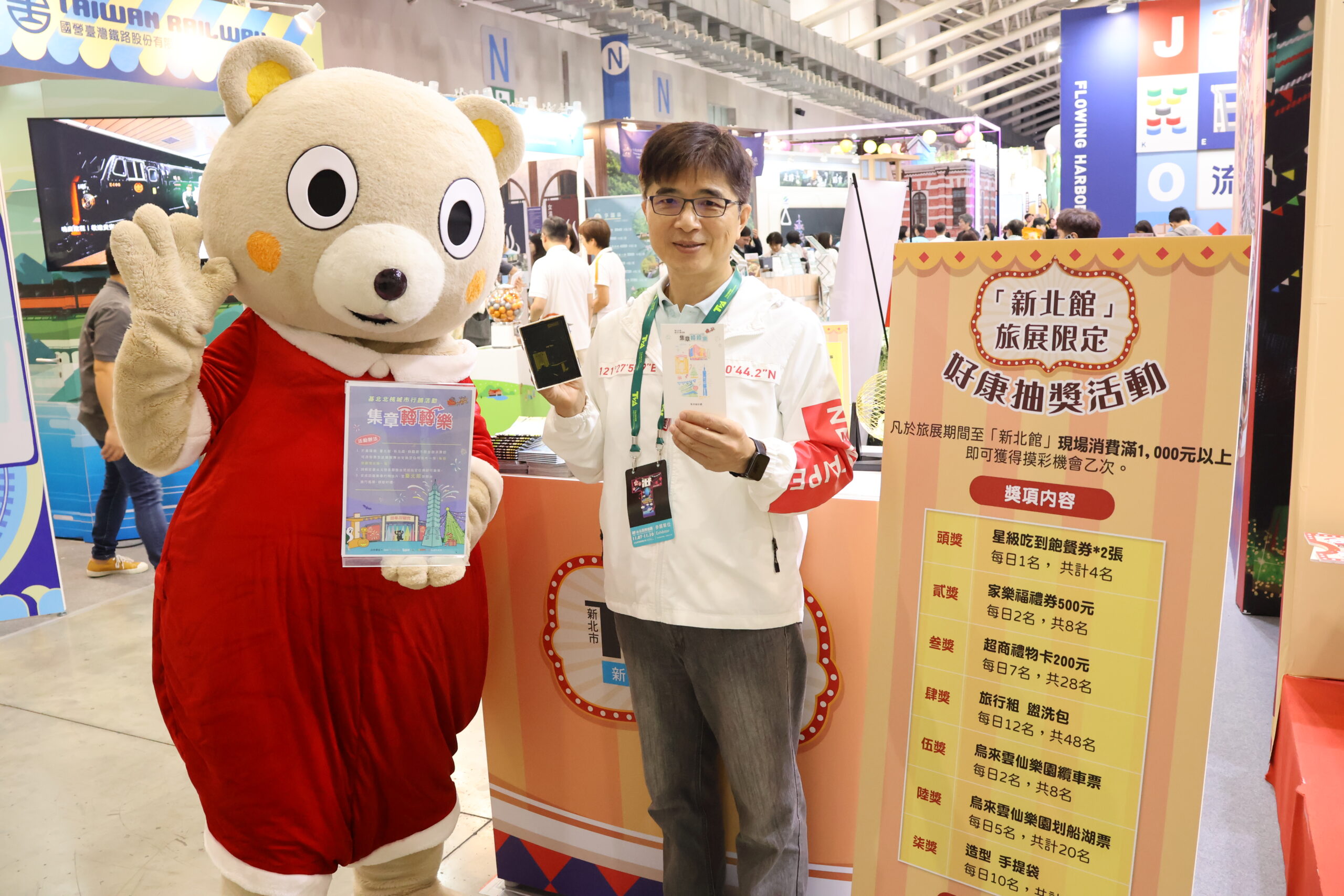 2025 ITF台北國際旅展今日於台北南港展覽館盛大開幕,新北市政府觀光旅遊局以「漾.新北」為主題,吉祥物「小客」現身與粉絲合照,互動玩遊戲,送好禮,吸引大批民眾湧入新北館,熱鬧非凡。新北館更與基隆館、台北館、桃園館推出疊色印章集章活動,凡於基北北桃四館不限金額消費,即可憑單據至該館服務台兌換空白明信片一張,再前往各館完成各館指定任務,就可至台北館服務台進行搖獎儀式,抽出基北北桃精選好禮。