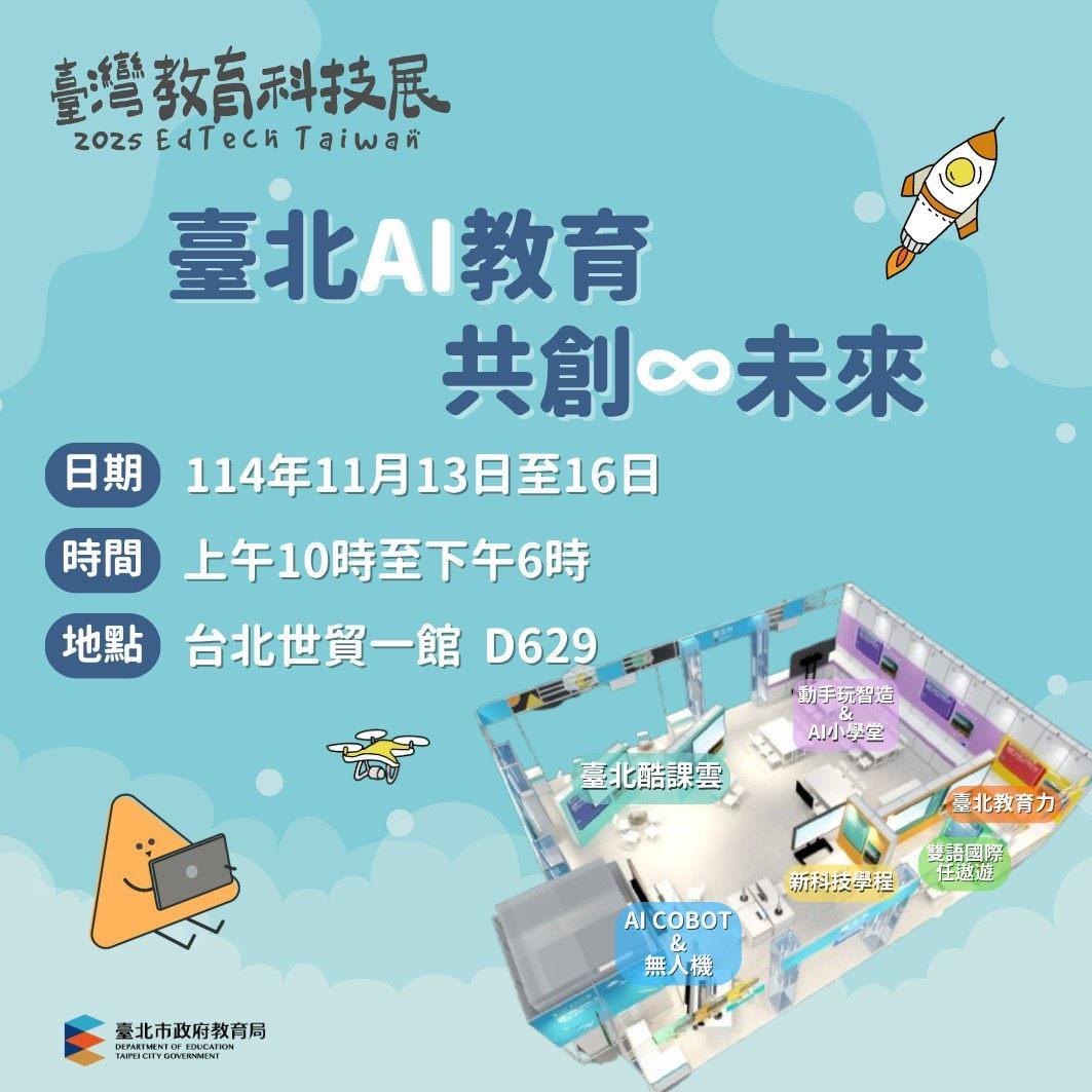 【臺北報導】2025臺灣教育科技展將於114年11月13日(星期四)至16日(星期日)於臺北世貿一館盛大登場,臺北市政府教育局將以「臺北AI教育 共創∞未來」為主題,展現在AI教育、數位素養與創新教學上的豐碩成果,現場也將提供多樣體驗課程、分享、體驗活動及闖關活動和多樣精美可愛的小禮物。