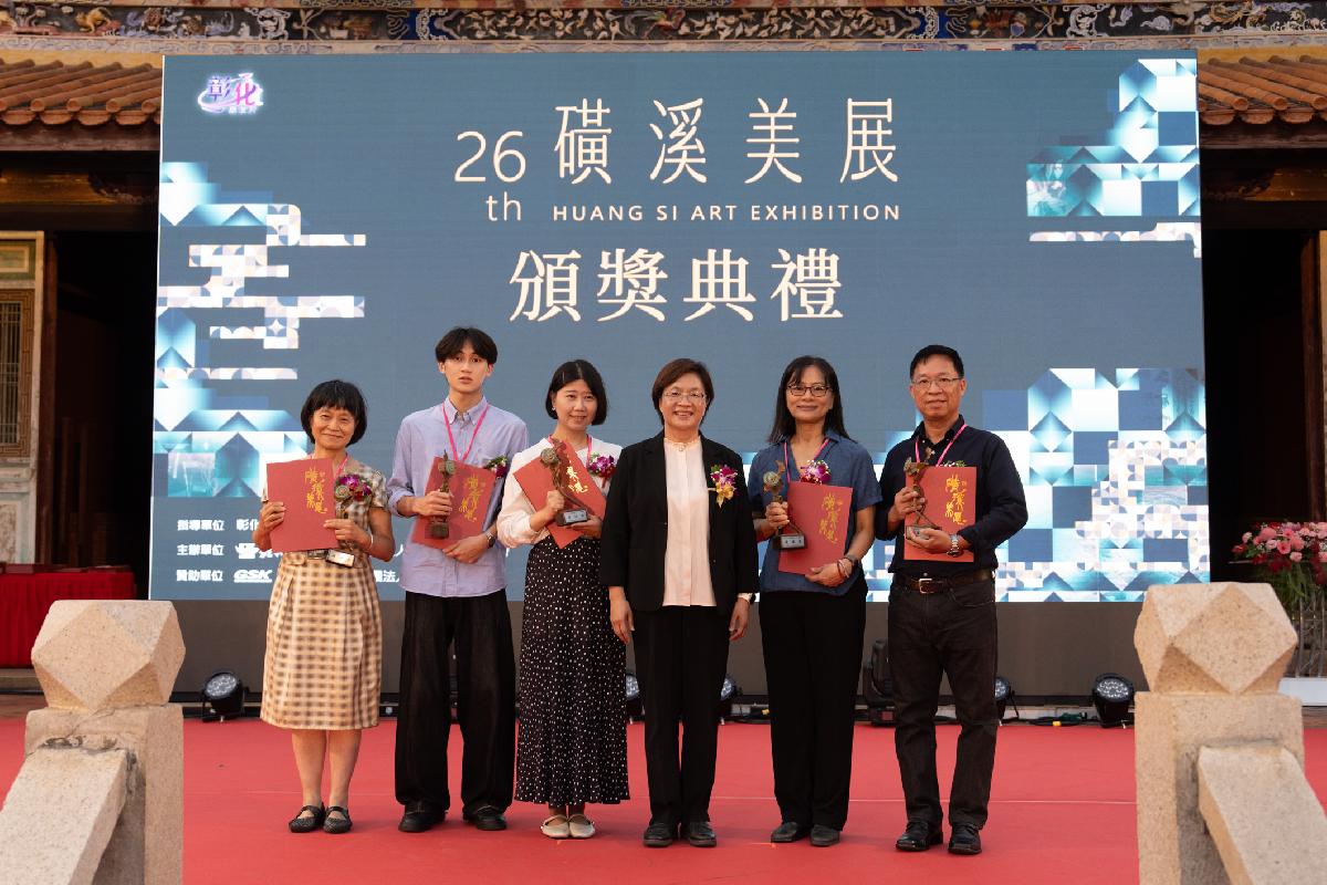 全國矚目的藝術盛會「第26屆磺溪美展」頒獎典禮今(8)日下午於彰化孔廟隆重舉行,縣長王惠美親臨頒發5位榮獲最高榮譽磺溪獎,恭賀得獎者傑出表現,並特別感謝全興關係企業執行長吳崇儀及財團法人全興文教基金會長期支持,亦向獎座設計者林慶祥教授及評審委員們致謝,肯定他們對彰化藝文發展的貢獻。