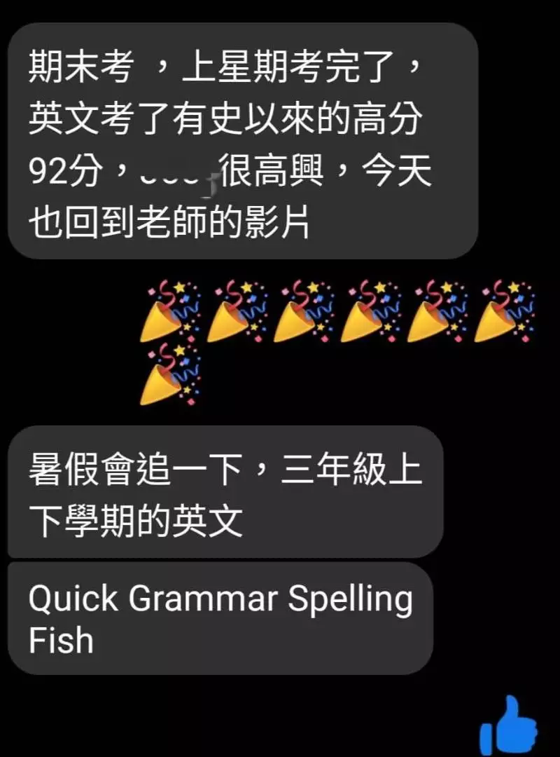 家長分享:「我原本以為三年級才開始學英文會太晚,孩子一開始連 CD 都不敢聽。沒想到每天五分鐘的影片,他竟然開始主動造句,還說英文變得有趣了!期末考拿到 92 分,我真的快哭了。」