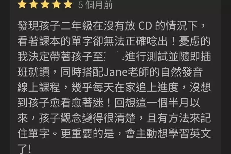 想讓孩子從挫折中翻轉導、真正愛上英文學習,現在就試試Jane老師自然發音課程,陪孩子一起開啟簡單容易上手的英文學習旅程。