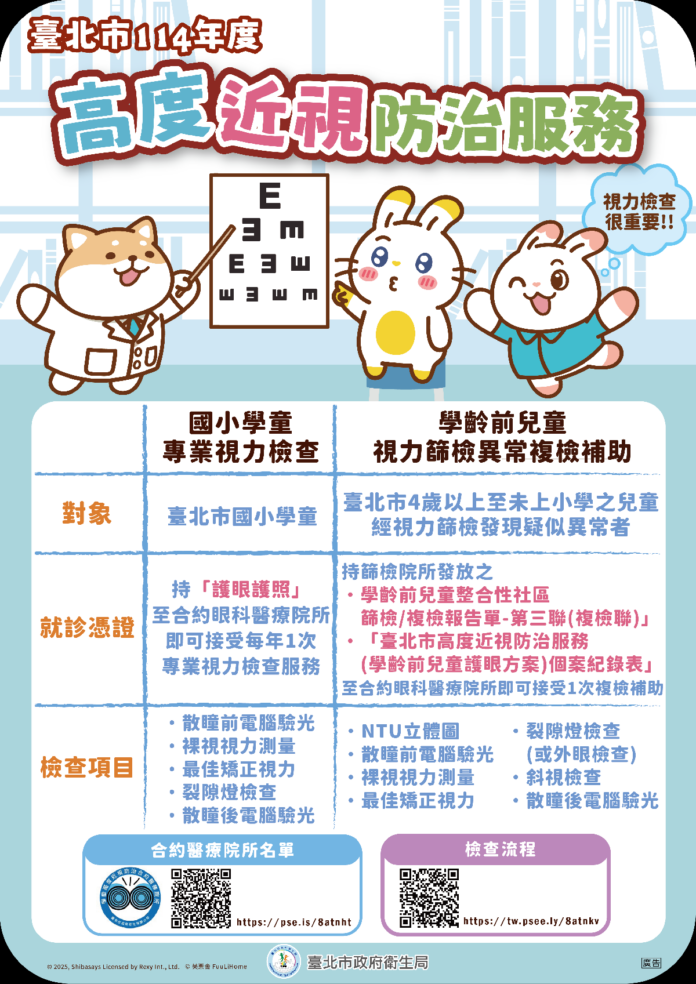 臺北市政府衛生局黃建華局長表示,臺北市102年起首創「國小學童高度近視防治服務」,提供設籍或就讀臺北市國小1至6年級學童享有1年1次免費專業視力檢查,不同於學校健康檢查使用E字表檢查,學童持護眼護照(或護眼卡)至眼科合約醫療院所,由專業醫師進行散瞳前後驗光、裸視視力、最佳矯正視力、裂隙燈檢查等檢查,並提供衛教及矯治建議。鑑於「幼兒園大班升小一」是兒童發生近視的三大高峰之一,113年起更擴大服務至學齡前兒童,提供「臺北市學齡前兒童整合性社區篩檢服務」視力篩檢疑似異常的兒童1次免費視力複檢,協助學齡前及學齡兒童家長有效掌握孩子視力狀況及養成定期視力檢查習慣!