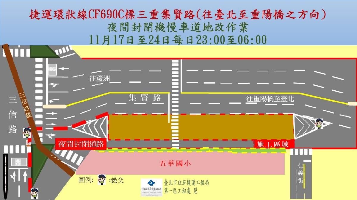 施工單位將自114年11月17日(一)至11月24日(一) 每日夜間23時至凌晨6時,於三重區集賢路(三信路口至重陽橋仁義街口)五華國小前,封閉機慢車道進行潛盾地改灌漿作業,施工範圍如附圖。 施工作業期間請用路人行經施工區域減速慢行,並依改道後之宣導牌面、遵循導引標誌及現場指揮人員指示減速慢行,以確保您的行車安全。施工期間民眾如有任何問題及建議事項,或想瞭解最新施工動態,可隨時利用下列聯絡電話反映,將有專人竭誠為您服務與解說,施工所造成之暫時不便,敬請 見諒。