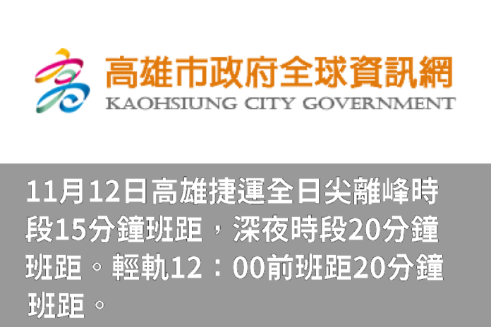 南部新聞高雄市11月12日高雄捷運全日尖離峰時段15分鐘班距,深夜時段20分鐘班距。輕軌12:00前班距20分鐘班距。