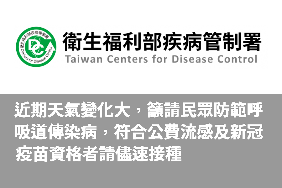 近期天氣變化大,籲請民眾防範呼吸道傳染病,符合公費流感及新冠疫苗資格者請儘速接種