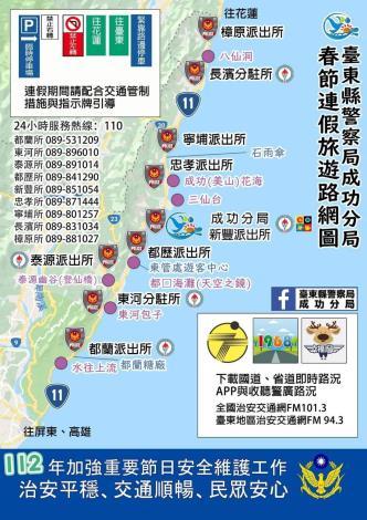 臺東縣警察局成功分局因應農曆春節連假到來,為維持春節假期交通順暢,預防事故發生與提升為民服務效能,特於本(1)月 10日召開「春節連假交通疏導工作協調會」,邀集轄區內各鄉(鎮)公所、公路總局第三區養護工程處臺東工務段、成功鎮農會等機關單位與會,針對轄區風景區易壅塞路段、節前年貨採購人(車)潮之交通疏導,以及即時路況報導工作及為民服務等議題提出策進作為。