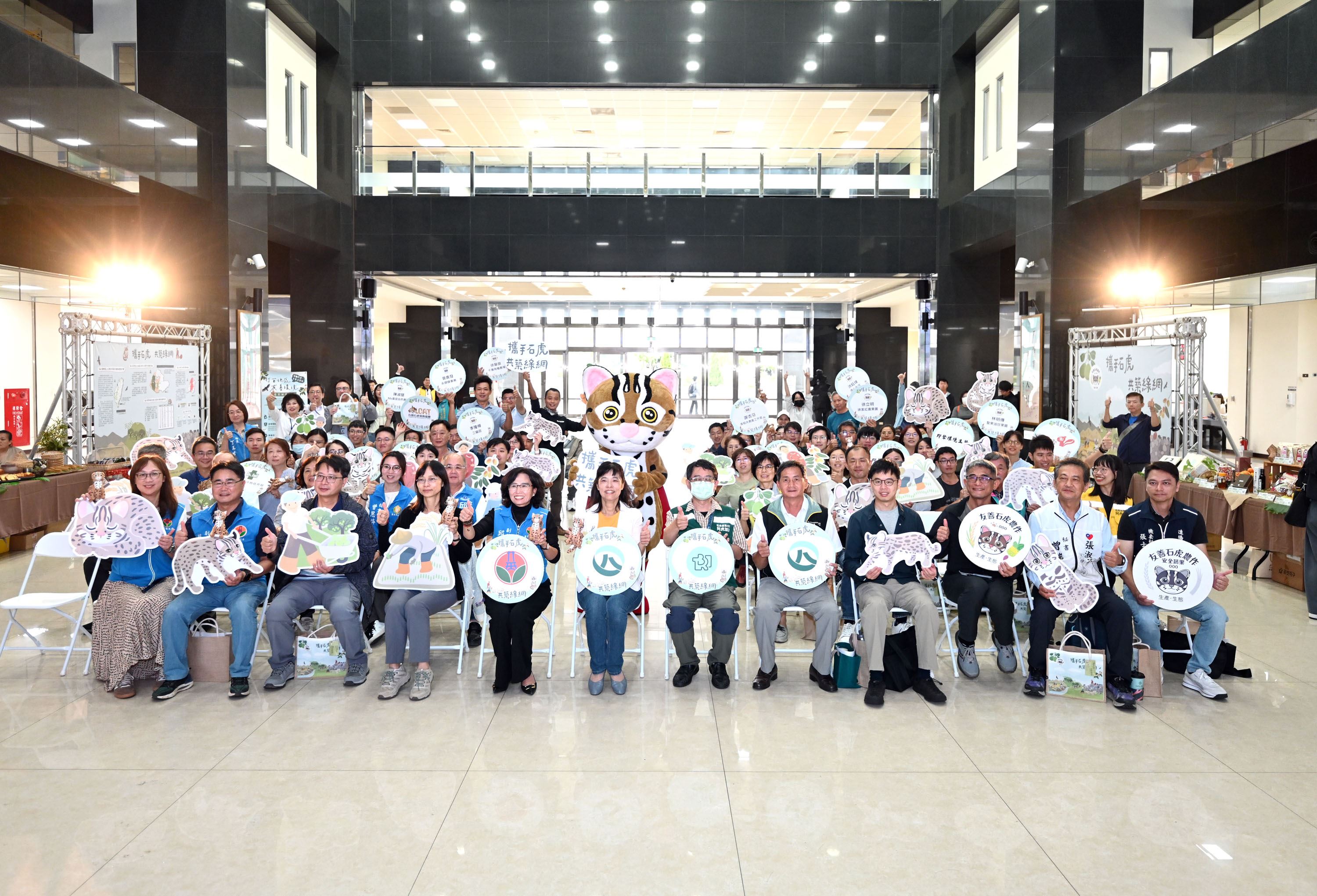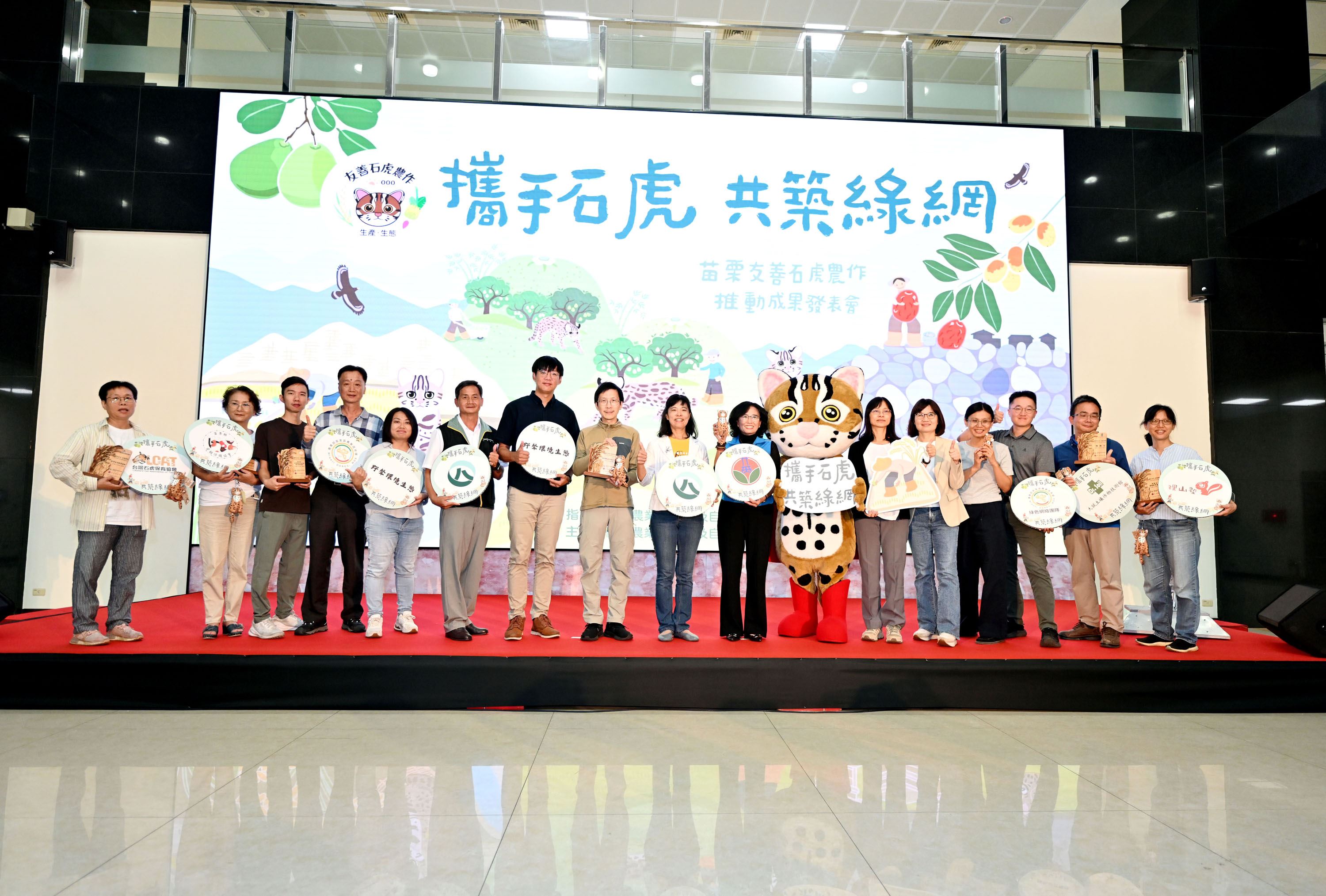 農業部林業及自然保育署新竹分署、農業部生物多樣性研究所與苗栗縣政府今天在縣府第一辦公大樓舉辦「攜手石虎 共築綠網-苗栗友善石虎農作推動成果發表會」,展示農友們的特色產品,並表揚16位長期投入的農友與苗栗區農業改良場等6個協力夥伴。副縣長邱俐俐表示,苗栗是全台石虎族群最密集的家園,目前有16位友善石虎農作農友,面積達18公頃,她感謝林業保育署、生物多樣性研究所及各協力單位長期支持,縣府也會持續扮演整合推動者的角色,讓「綠網」不只是保育名詞,而是守護山城的行動力量。