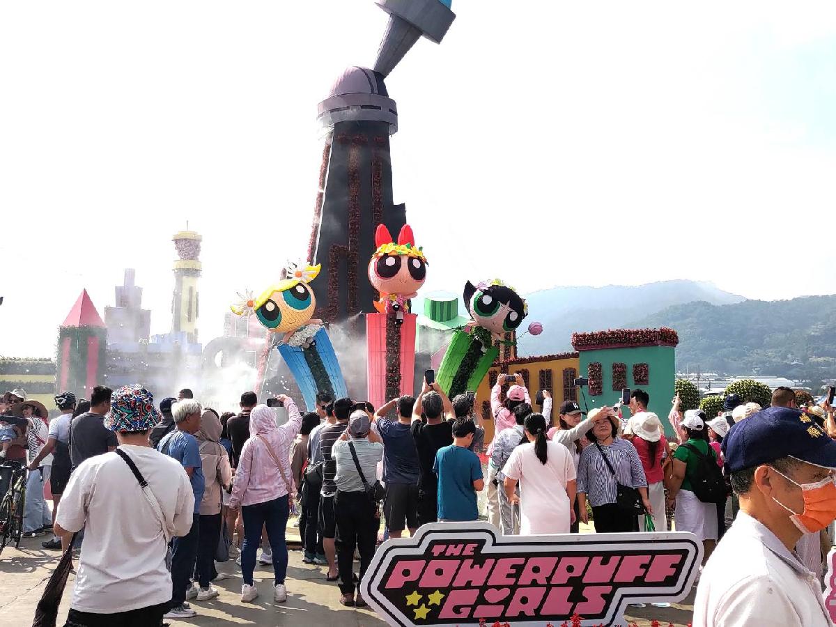因應颱風鳳凰氣象署發布陸上警報及台中市府公布停班停課,台中國際花毯節為維護遊客及展區裝置安全,於11、12日預警性閉園,今日宣布明(13)日重新開園!園區經市府團隊及工作人員將裝置重新歸位,已全面恢復繽紛樣貌。今年以經典卡通頻道《飛天小女警》為靈感,將備受喜愛的動畫元素與花卉藝術結合,吸引大批遊客搶先入園拍照打卡。