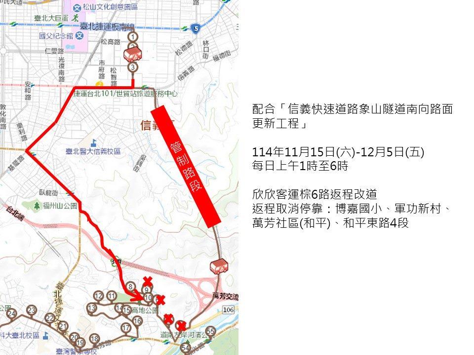 臺北市公共運輸處表示,因應「信義快速道路象山隧道南向路面更新工程」,自114年11月15日(星期六)至12月5日(星期五),每日上午1時至6時,管制信義快速道路北往南方向,棕6路公車將受影響,並取消停靠返程「博嘉國小」、「軍功新村」、「萬芳社區(和平)」及「和平東路4段」共4個站位,公車改道及取消站位如附表。