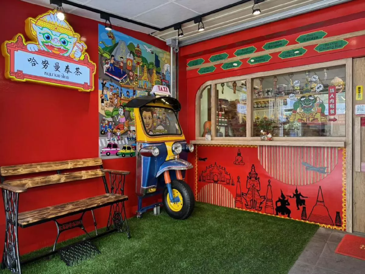 店內八成以上裝潢與擺飾從泰國運回,包括一輛退役的嘟嘟車車頭,以及原木工作台,由總店創辦人親自監工,營造濃厚泰國氛圍。