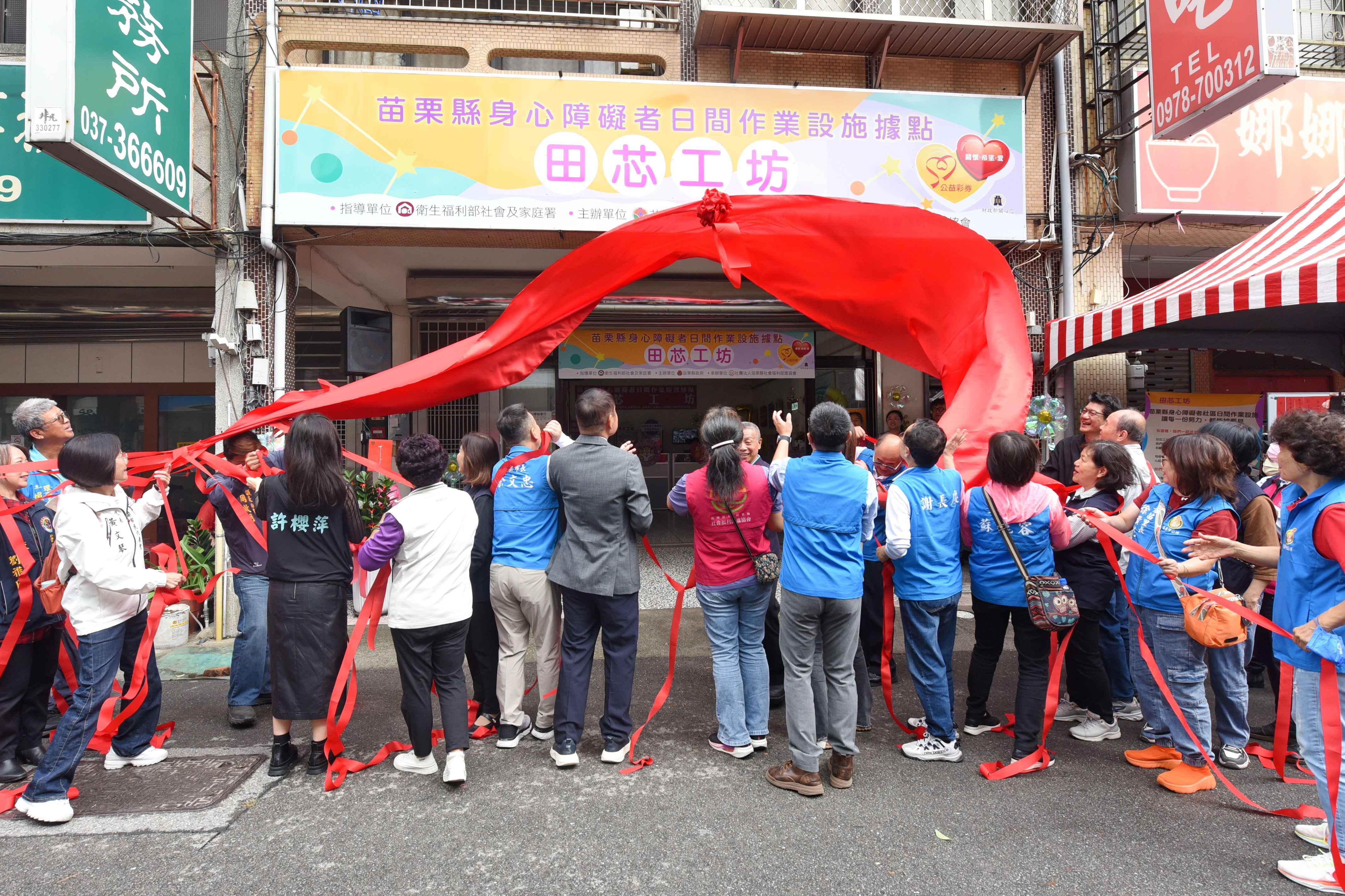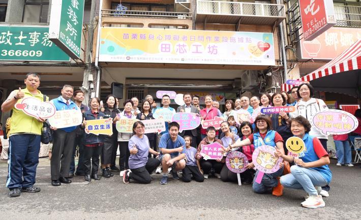 苗栗縣政府對身心障礙者及其家庭的需求感同身受,另考量身障者難免因年齡增長及家庭照顧能力退化而面臨困境,積極爭取衛福部社會及家庭署資源設立社區式日間作業據點;全縣第七處小型作業所「田芯工坊」13日在苗栗市溫馨揭牌。縣長鍾東錦表示,提供友善環境照顧身障者,縣府責無旁貸,未來將廣設小作坊,讓更多心智障礙者快樂學習、延緩老化,也享受自己的人生。