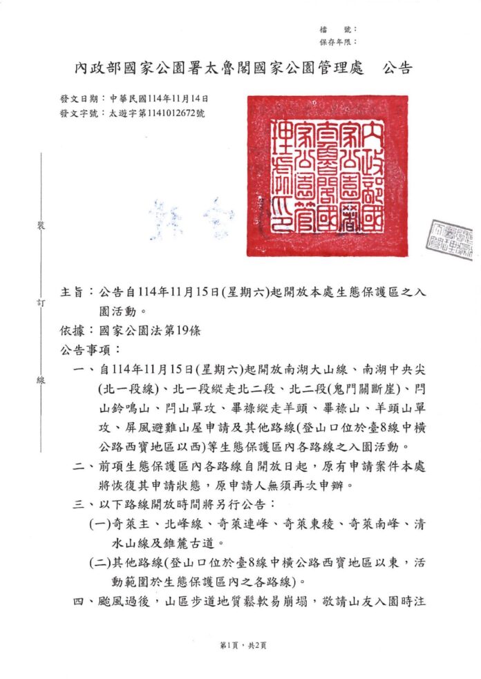 一、自114年11月15日(星期六)起開放南湖大山線、南湖中央尖(北一段線)、北一段縱走北二段、北二段(鬼門關斷崖)、閂山鈴鳴山、閂山單攻、畢祿縱走羊頭、畢祿山、羊頭山單攻、屏風避難山屋申請及其他路線(登山口位於臺8線中橫公路西寶地區以西)等生態保護區內各路線之入園活動。