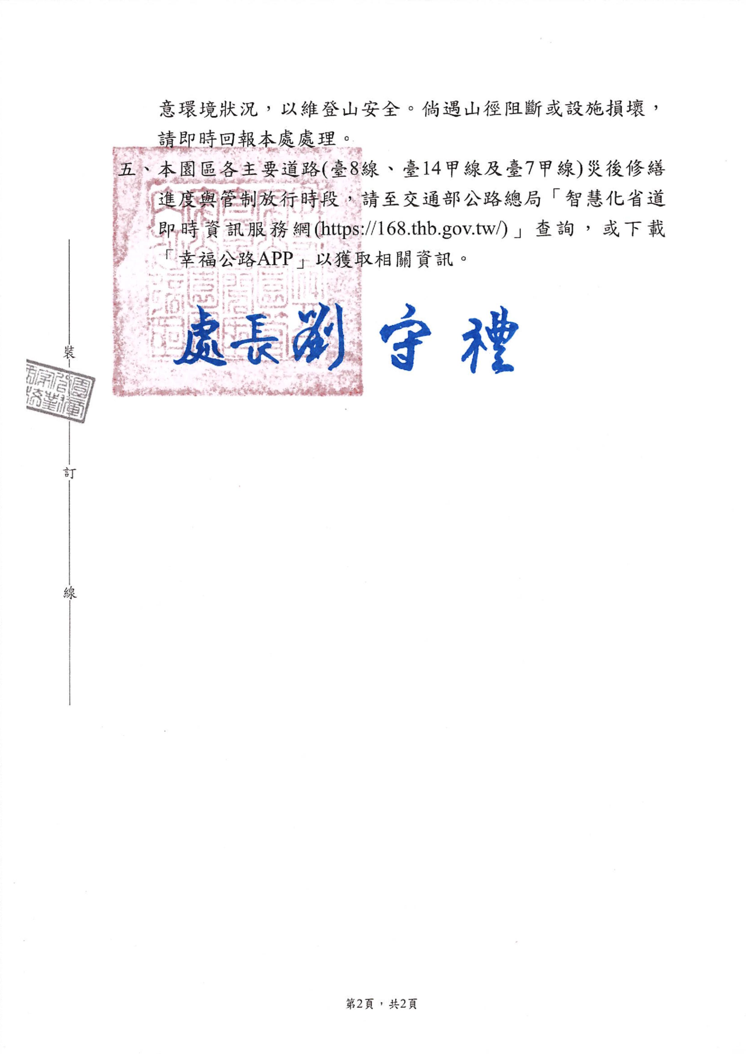 五、本園區各主要道路(臺8線、臺14甲線及臺7甲線)災後修繕進度與管制放行時段,請至交通部公路總局「智慧化省道即時資訊服務網」查詢,或下載「幸福公路APP」以獲取相關資訊。