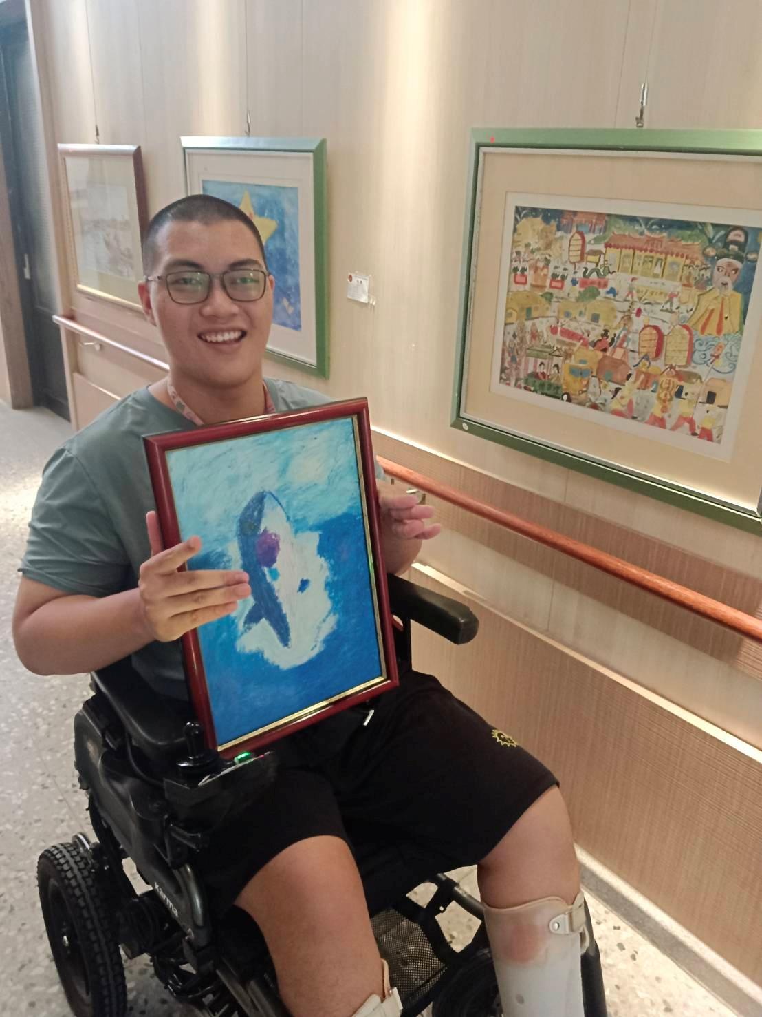 115年度桌曆以「聽海說故事」為主題,學生從寬廣無垠的海洋意象出發,用熟悉的媒介與素材,創作出獨一無二的作品。像高中部的陳柏翰,沒有因行動不便而停止對美的探索,反而是用堅毅的心境學習與創作,他的作品《無聲地訴說》,以大膽筆觸刻畫大海中堅定向上的鯨魚,象徵面對生命挑戰不退縮的力量!