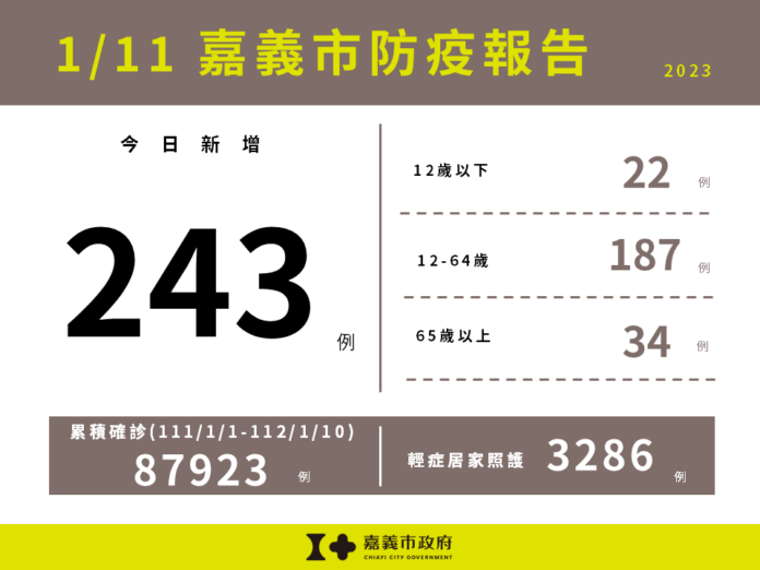 中央流行疫情指揮中心今(1/11)日公布嘉義市新增243例確診個案,包含12歲以下22例,12-64歲187例,65歲以上34例。嘉義市目前輕症居家照護人數3,286人。111/1/1截至112/1/10嘉義市累計確診嚴重特殊傳染性肺炎本土病例數為87,923人。 衛生局提醒,請大家儘速接種疫苗,並持續落實勤洗手、咳嗽禮節及佩戴口罩等防疫措施,避免出入人多擁擠的場所及高感染傳播風險場域,如出現疑似症狀,儘速快篩就醫和遵從醫囑及早服藥,降低重症及死亡風險;並請養成規律運動、均衡飲食、充足睡眠、壓力調適、不吸菸等健康習慣,提升免疫力,守護自己與家人的健康。