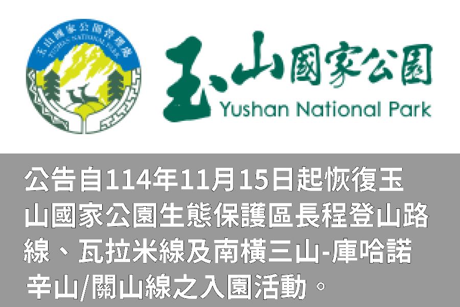 主旨:公告自1141115日起恢復玉山國家公園生態保護區長程登山路線、瓦拉米線及南橫三山庫哈諾辛山/關山線之入園活動。