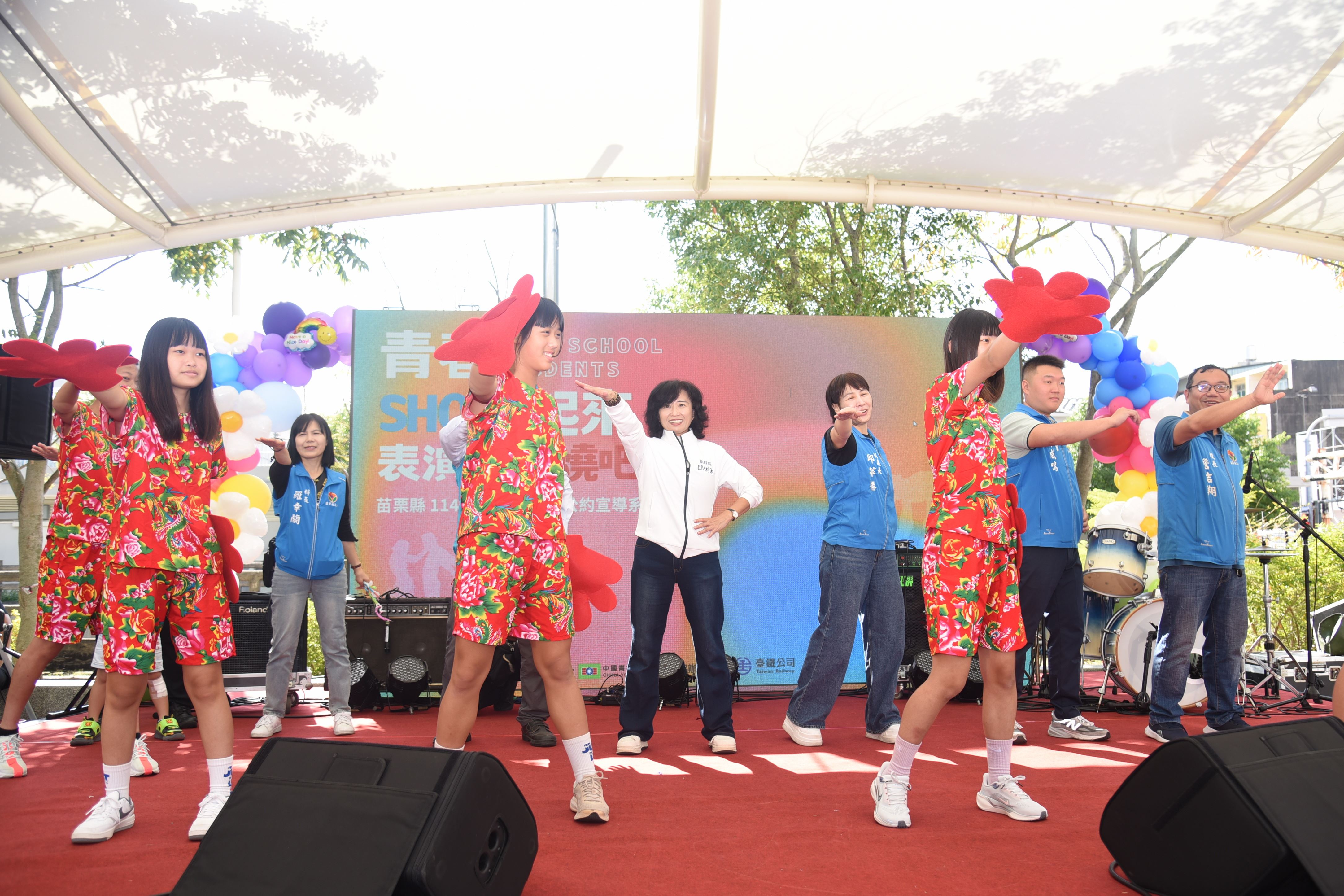 苗栗縣政府16日在苗栗火車站西站廣場,舉辦「青春Show起來!表演魂燃燒吧!」展演活動,邀請22組團隊、逾200名兒童及少年接力表演歌舞節目,周邊的青創市集也熱鬧滾滾。副縣長邱俐俐不僅與青少年同台「舞」力全開,洋溢青春活力,她肯定活動規畫充分呈現公私協力推動兒少政策的豐碩成果,更是《兒童權利公約》的具體實踐,落實保障兒少權益。