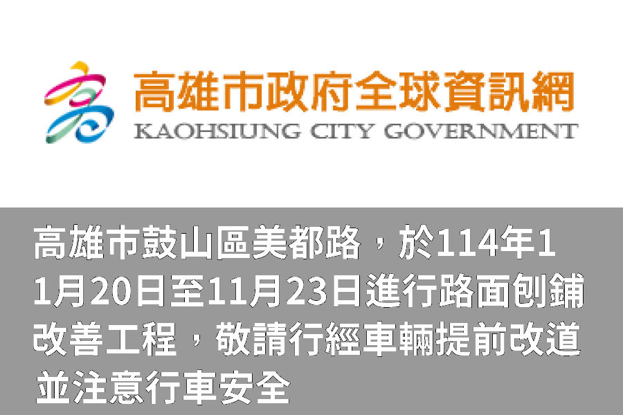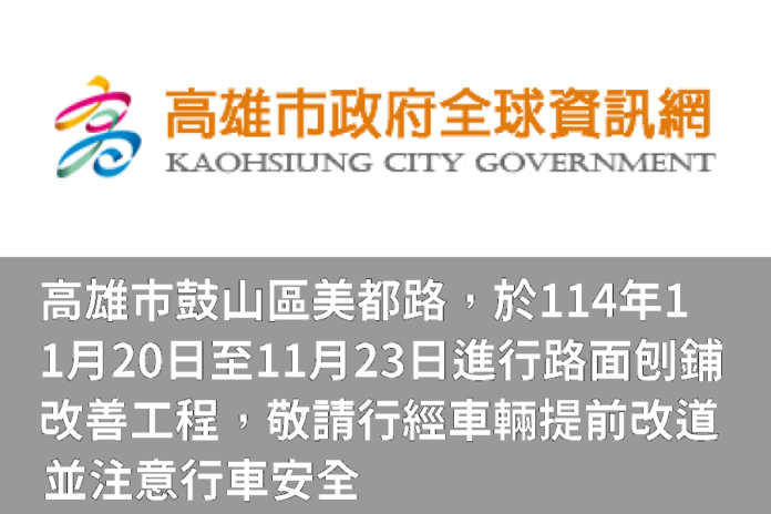 高雄市鼓山區美都路,於114年11月20日至11月23日進行路面刨鋪改善工程,敬請行經車輛提前改道並注意行車安全