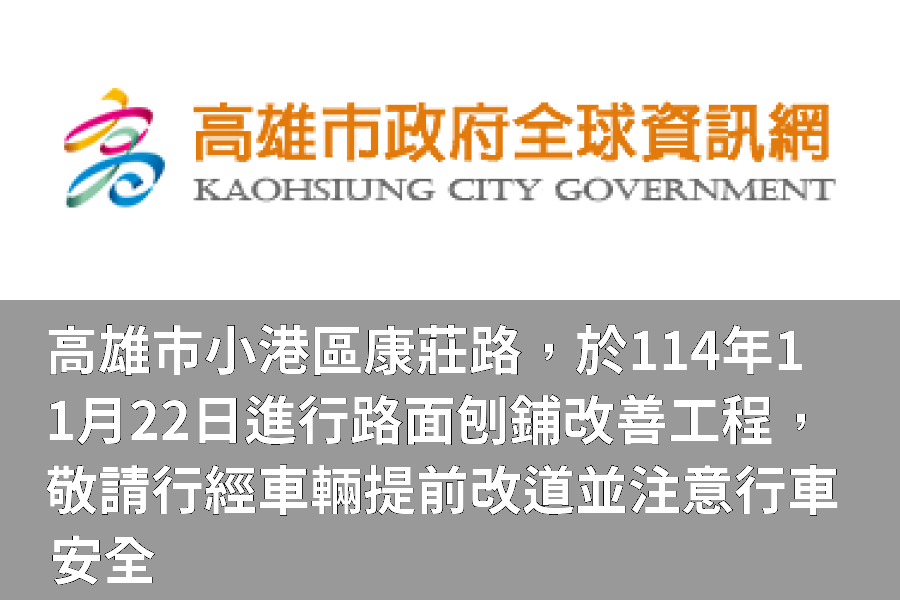 南部新聞高雄市高雄市小港區康莊路,於114年11月22日進行路面刨鋪改善工程 ,敬請行經車輛提前改道並注意行車安全