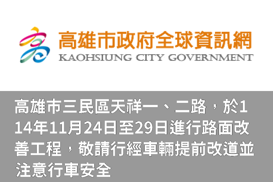 高雄市三民區天祥一、二路,於114年11月24日至29日進行路面改善工程,敬請行經車輛提前改道並注意行車安全