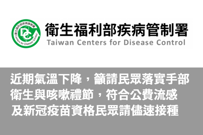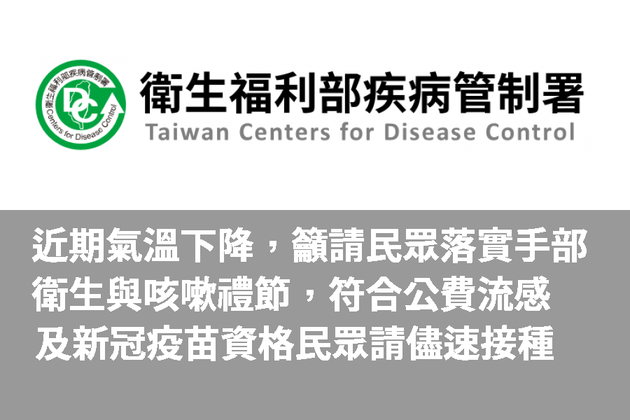 近期氣溫下降,籲請民眾落實手部衛生與咳嗽禮節,符合公費流感及新冠疫苗資格民眾請儘速接種
