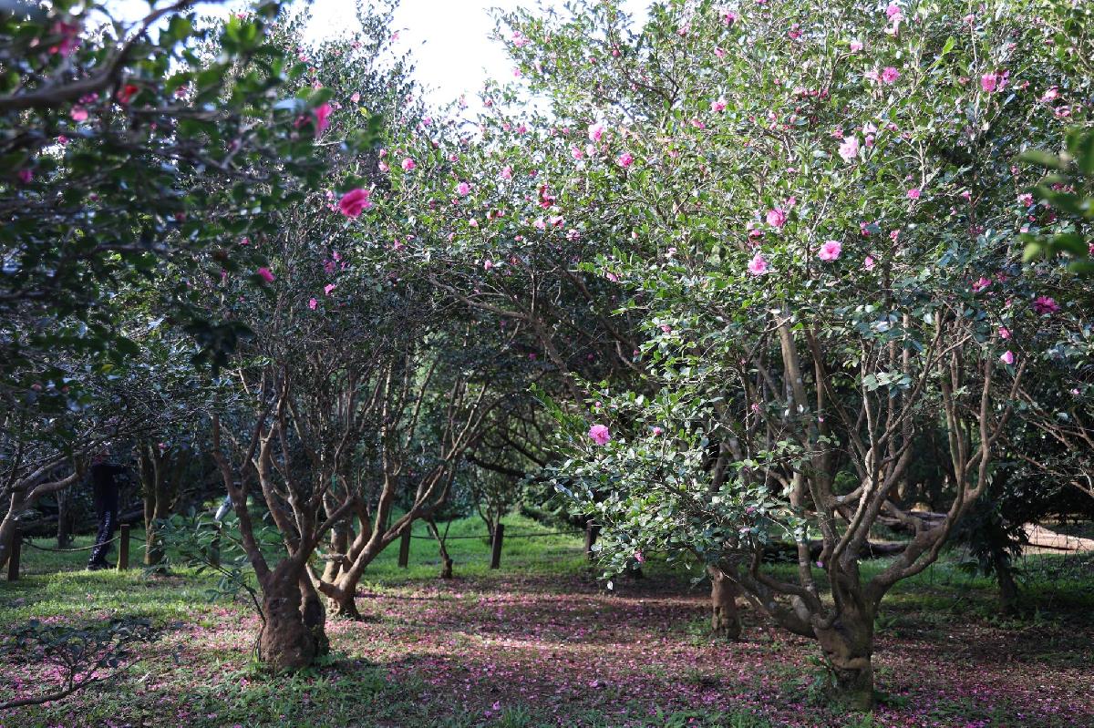 花卉試驗中心林育正主任表示,除楓樹與銀杏外,園區著名的茶花也陸續綻放,而最早迎來花期的是「茶梅」。走入茶梅花間,可聞到淡雅清香;不濃烈、不張揚,卻帶來冬日特有的沉靜與溫暖。茶梅多為柔粉色系,姿態清新雅緻;與茶花最大的不同在於落花方式,茶花多整朵掉落,而茶梅則以片片花瓣輕落。當花季漸深,樹下鋪滿落瓣,形成自然而柔美的景象。
