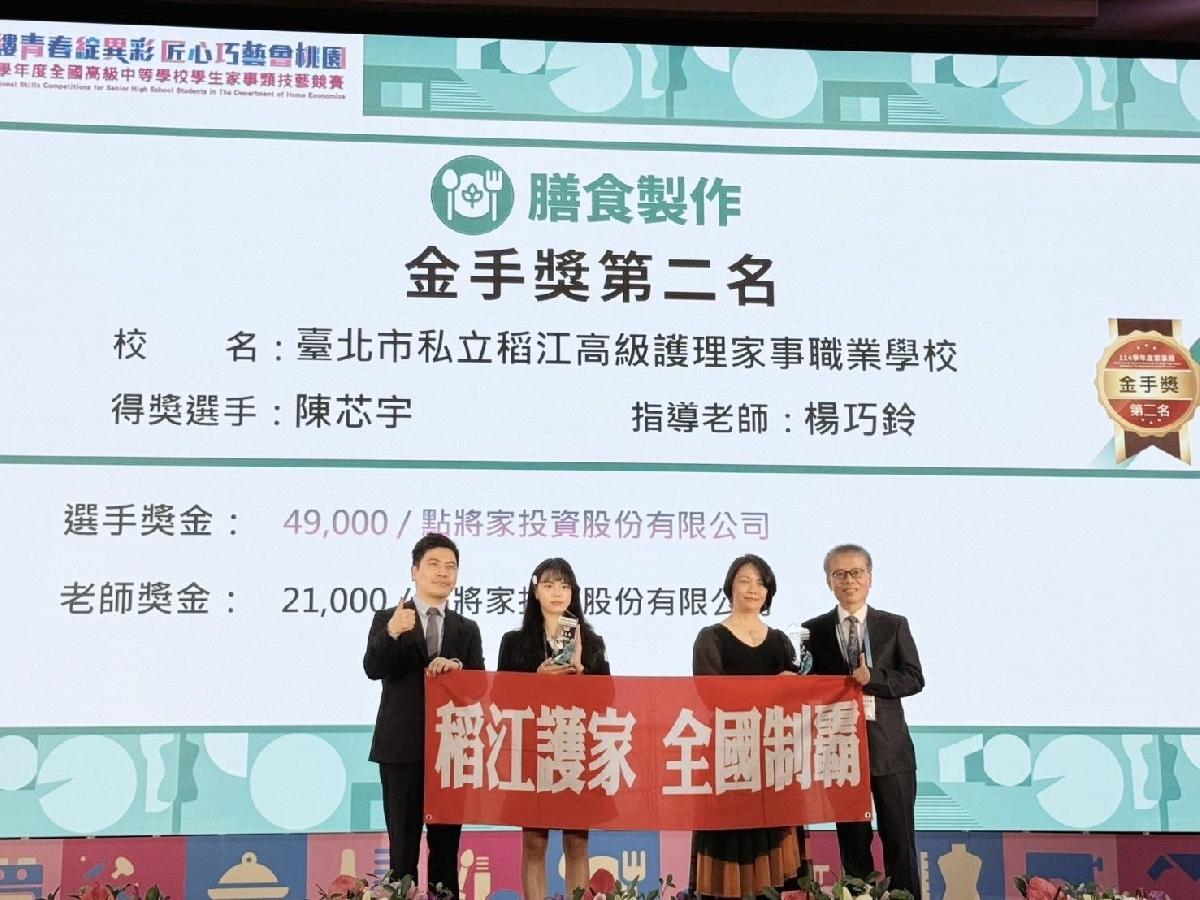 在本次競賽膳食製作職種勇奪金手獎第2名的稻江護家陳同學表示,競賽題目食材為「蓮藕」,是她於訓練中未接觸過的材料,但憑藉扎實的日常練習,得以在賽場上迅速構思多種料理方向,最終她以擅長的「捲類料理」呈現蓮藕的多層風味,展現個人獨到的創意,她也感謝師長平時的耐心指導與嚴謹訓練,讓她在面對突發狀況時能保持冷靜、逐一排除問題,並在時限內完成作品,展現穩健的臨場反應與紮實的技術底蘊。