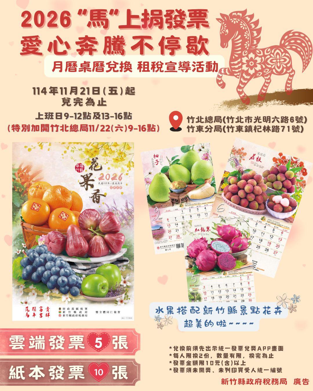 為迎接嶄新的一年,新竹縣政府稅務局將於114年11月21日(五)上午9時起,於竹北總局及竹東分局推出一年一度最受期待的捐發票兌換月曆及桌曆活動,今年以「2026『馬』上捐發票,愛心奔騰不停歇」為主題,邀請大家攜手以愛心與活力迎接2026年的到來!