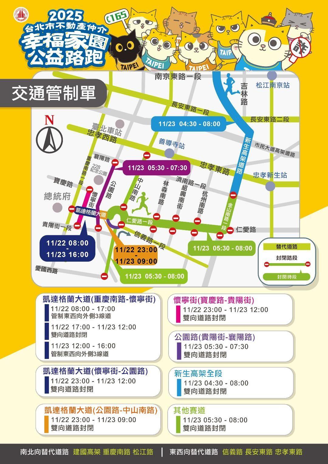 台北市不動產仲介同業經紀商業同業公會、創意實踐家企業股份有限公司及台灣路跑運動協會訂於114年11月23日(星期日),假本市凱達格蘭大道等道路辦理「2025台北市不動產仲介幸福家園公益路跑」,為維護交通秩序與活動安全,臺北市政府警察局將實施交通管制,禁止車輛通行,管制路段及時間如下: