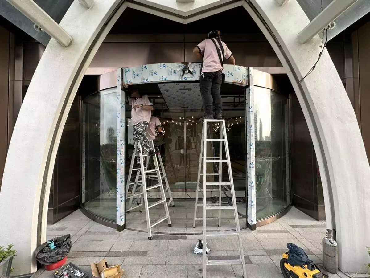 ▲高雄雙開式自動門施工中,工程團隊精準校正門軌,確保開啟順暢與安全防夾設計(圖/Medick Marketing Ltd.提供)