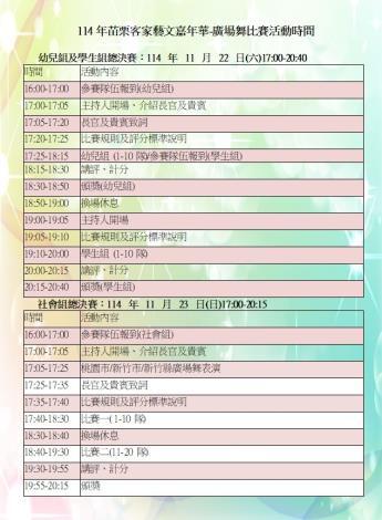 為讓更多民眾親近客家文化、學習客語,「114年苗栗客家藝文嘉年華-廣場舞比賽」總決賽於11月22、23日傍晚5時起在頭份尚順育樂世界空橋下廣場登場,有幼兒組、學生組及社會組共40隊800多名選手同場競技,今年也特別邀請桃竹竹三縣市的廣場舞團隊共襄盛舉,歡迎鄉親共下來鬥鬧熱,為選手加油打氣。