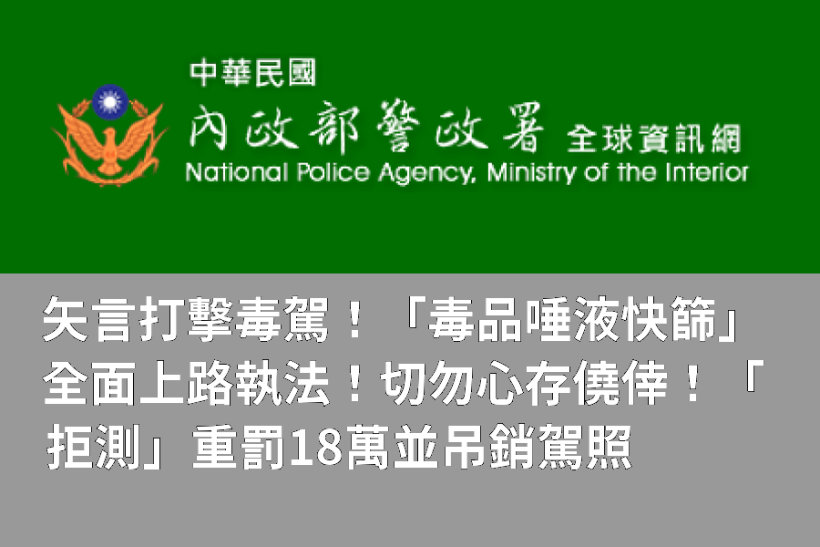 為有效打擊吸食毒品後駕車(毒駕)案件,警政署研議「毒品唾液快篩試劑檢測」執法策略,經會同交通部增訂「違反道路交通管理事件統一裁罰基準及處理細則」第19條之4,律定實施毒品唾液快篩檢測及拒測之處置程序,相關條文已於114年11月19日正式公告施行。另為確保本項新式執法策略完備,警政署亦即函頒「毒品唾液快篩執法」作業程序,並通令全國各警察機關於今(20)日起,正式全面上路執法。
