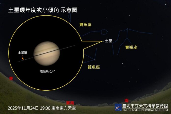 土星目前位於寶瓶座與雙魚座之間,入夜後不久即會通過中天,是觀測土星的最佳時段。值得一提的是,土星直徑約12萬公里、土星環的直徑約28萬公里,但土星環的平均厚度卻僅約 12 公尺,宛如太空中的薄片。當土星環傾角縮小到接近零度時,這片細薄的光環便會呈現最銳利的「刀鋒視角」,是全年難得一見的特殊景象。